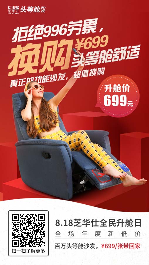 由于功能沙发相比较普通的沙发价格会昂贵一些,部分家庭并不一定舍得购买。而在“芝华仕818全民升舱日”活动中,消费者只要在芝华仕专卖店所在商场,购买两个及以上不同品类产品即可在芝华仕门店+699元换购F-K918BM单椅一张。这就大大降低了普通家庭的经济压力,从而让更多的普通家庭能够拥有一张又气派又享受的功能沙发。