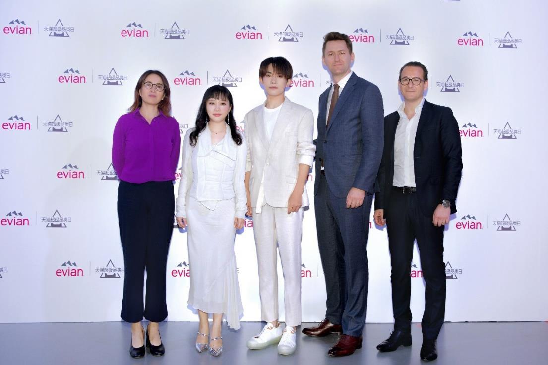 依云开启#我还要活出年轻#传播战役,从右往左:达能依云大中华区及日本地区市场总监 Gianluca Ferrante 先生、达能依云大中华区及日本地区总经理 Renaud Marchand 先生、依云品牌全球代言人易烊千玺、天猫品牌营销中心总经理秀珣、天猫大食品总裁无龄
